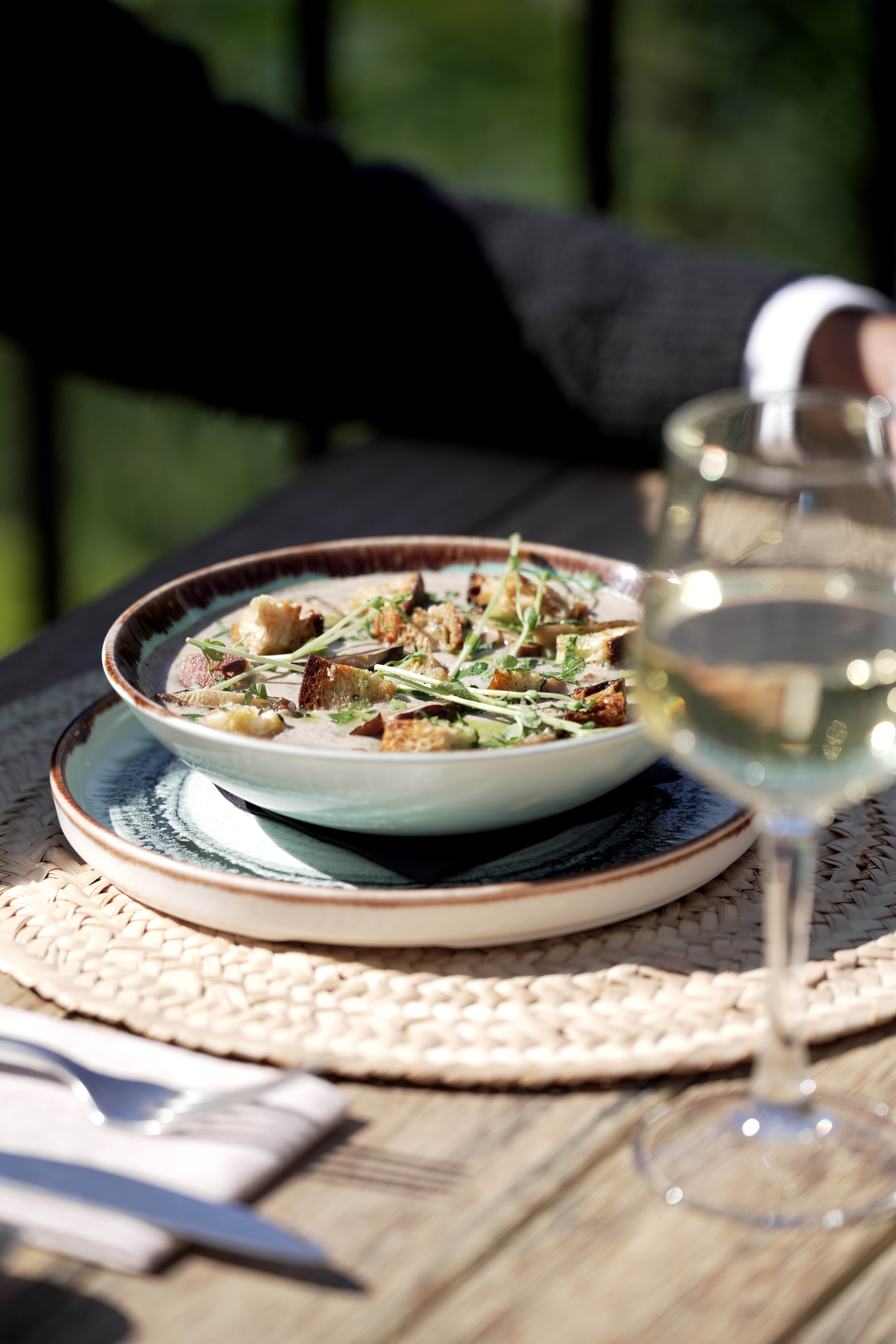 Crémeux de champignons, champignons sautés, croûtons persillés, parmesan et huile verte d’herbes fraîches Selon l’arrivage frais de notre primeur : Pleurotes, champignons de Paris, shiitakés