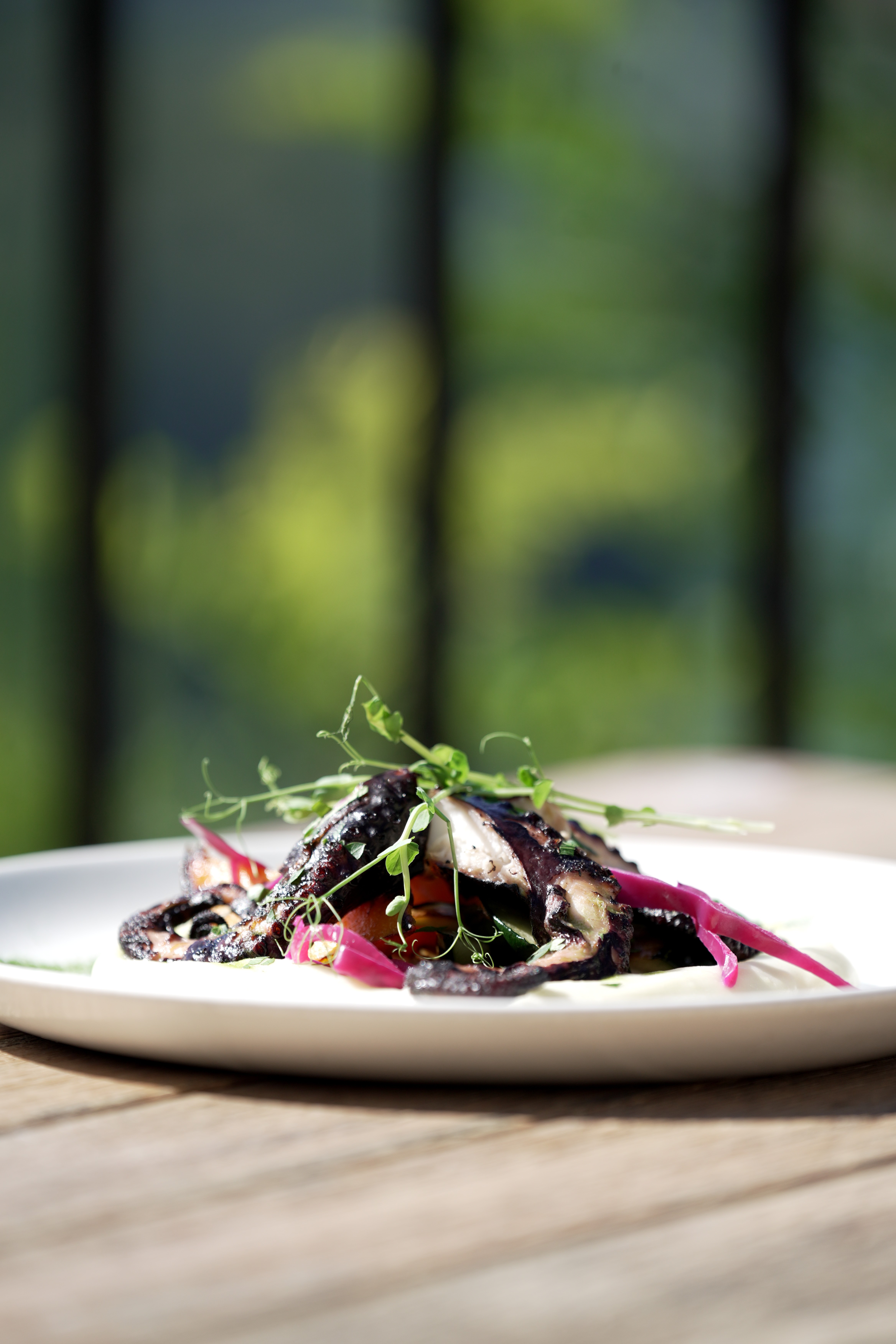 Poulpe grillé à la plancha, légumes de saison, châtaignes snackées et jus de viande
