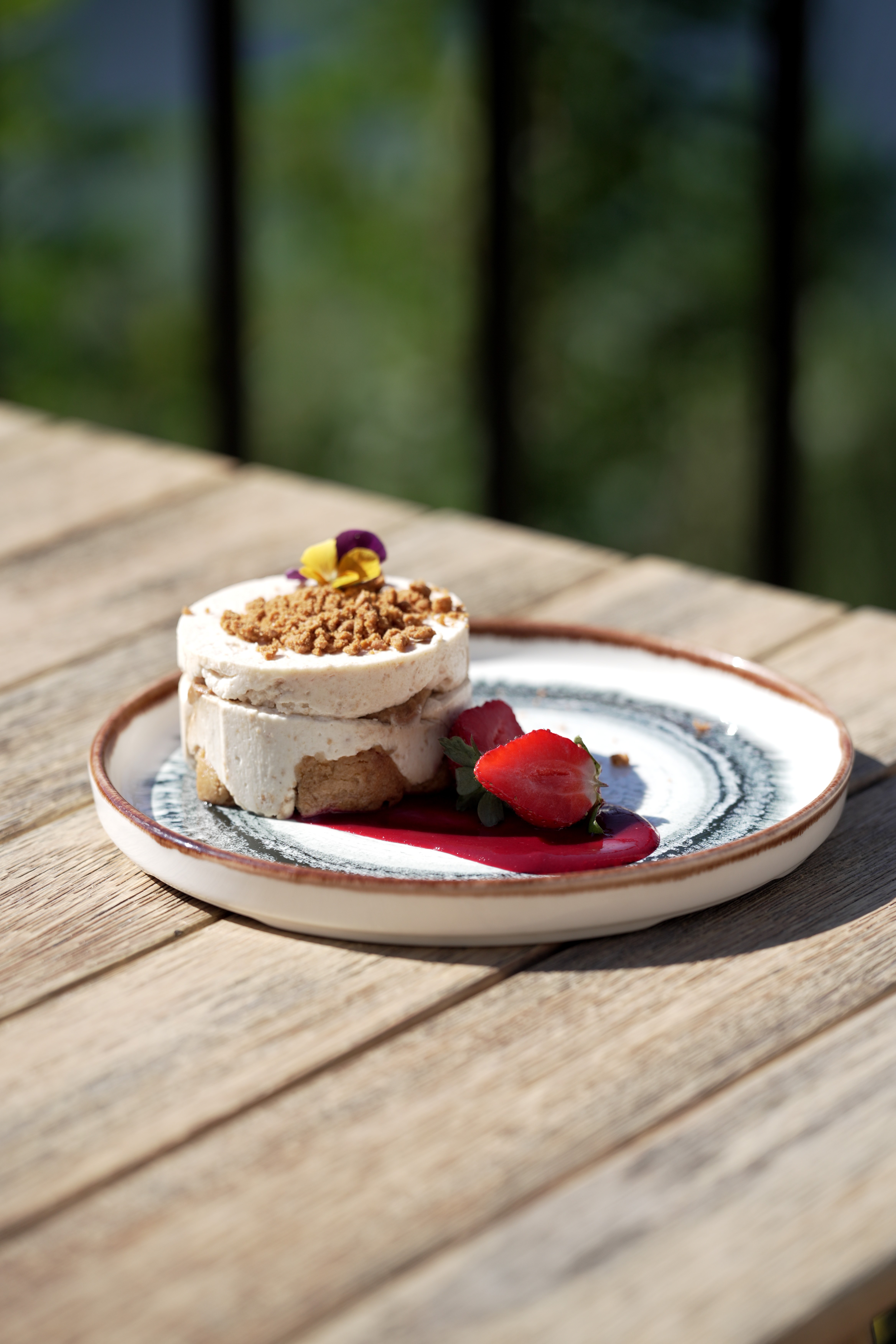Pomme du Pilat rôtie au four, crumble de fruits secs, glace vanille et éclats de noisettes